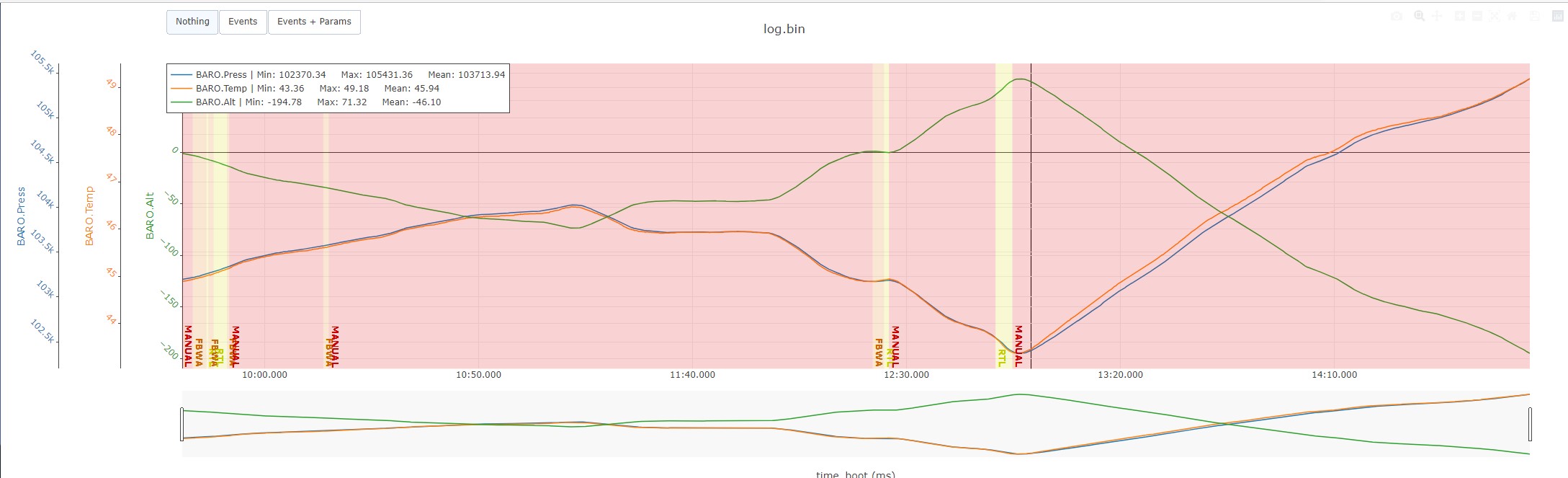 More concerning, the barometer altitude is between -10 and -70m in the ~1 minute before launch on the ground. The calculated AHRS (Attitude Heading Reference System) altitude at somewhat similar, -9 and -80 🫤